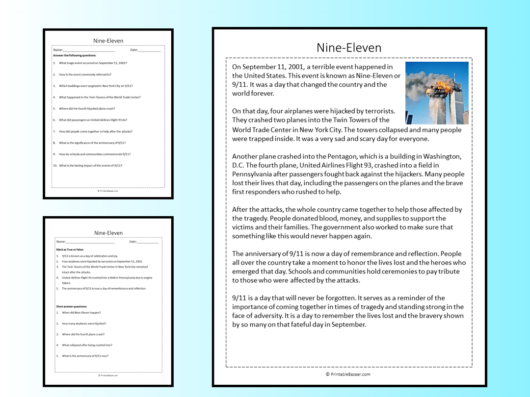 Nine Eleven Reading Comprehension Passage Printable Worksheet Teaching Resources
