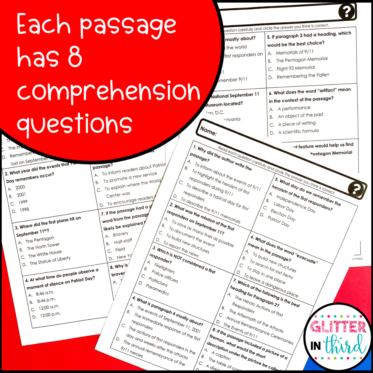 September 11 Patriot Day Reading Comprehension Passages Activities