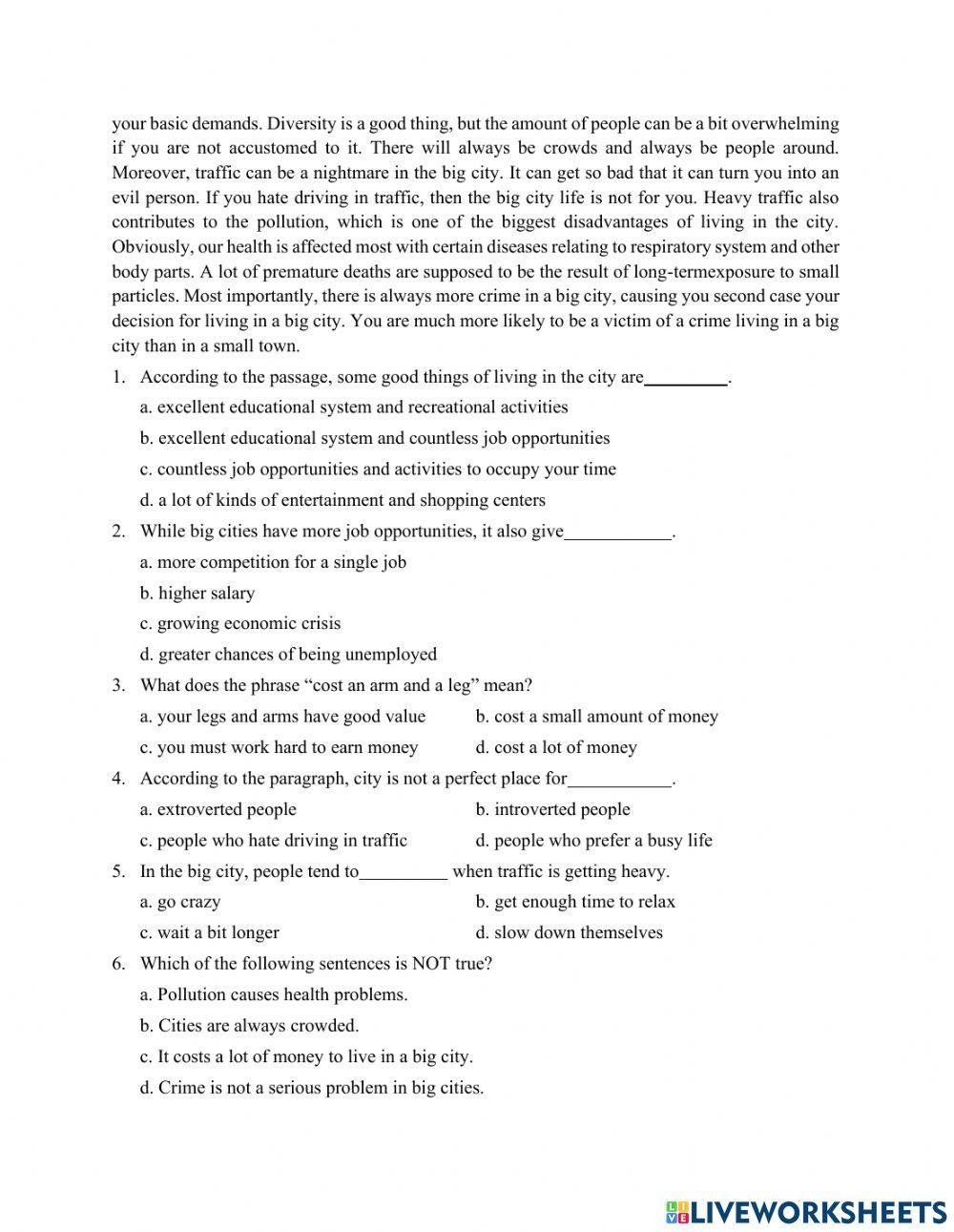 Reading Comprehension For 9th Grade ESL Worksheet By Cindybindy