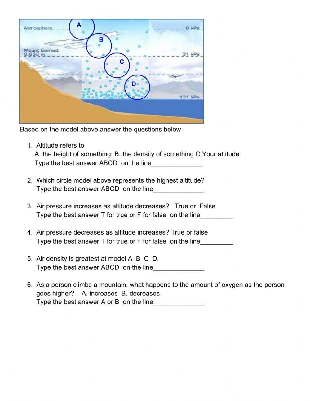 With this worksheet, students will be able to test their knowledge and comprehension of air pressure through a series of questions and activities. From understanding how air pressure affects weather patterns to learning about the tools used to measure air pressure, this worksheet covers it all.