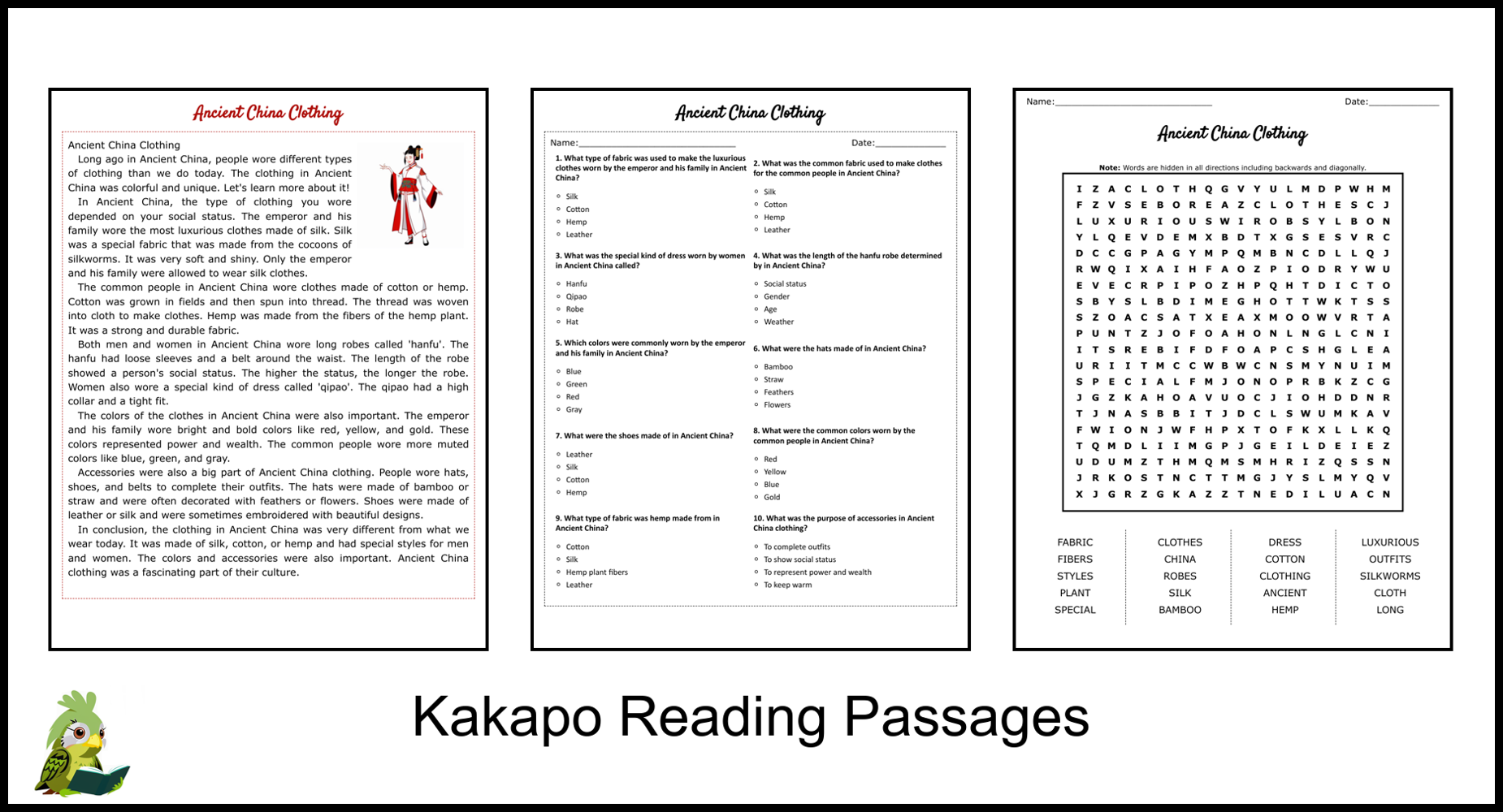 Ancient China Clothing Reading Comprehension And Word Search