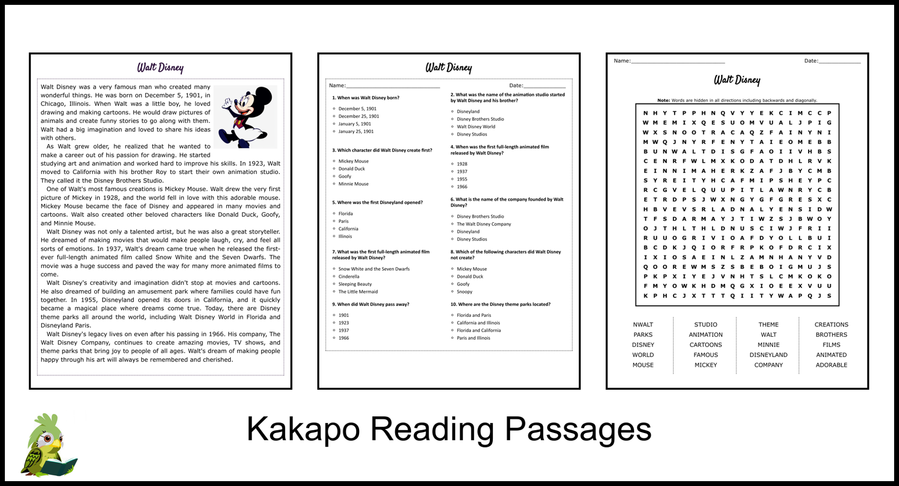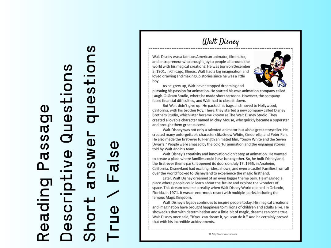 Walt Disney Biography Reading Comprehension Passage Printable Worksheet PDF Teaching Resources