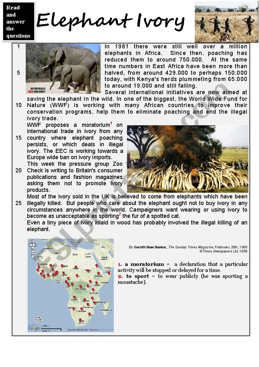 Elephant Ivory Reading Comprehension KEY ESL Worksheet By Karagozian