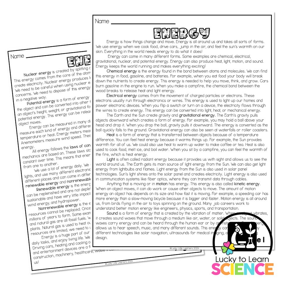 Lucky To Learn Science Energy Reading Passage Article Lucky
