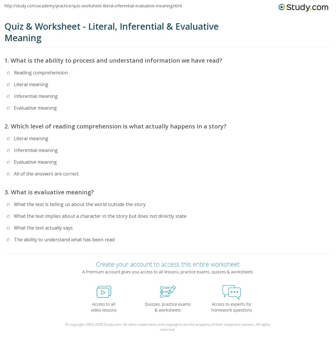 Quiz U0026 Worksheet Literal Inferential U0026 Evaluative Meaning