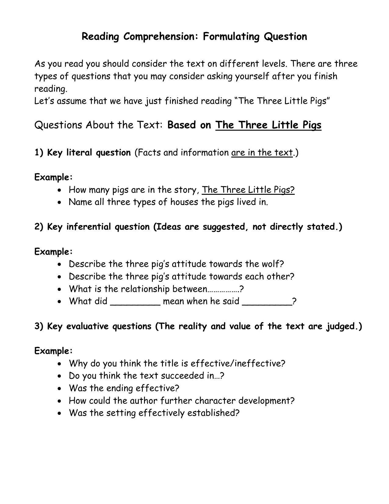 Evaluative Questions Reading Comprehension Worksheets