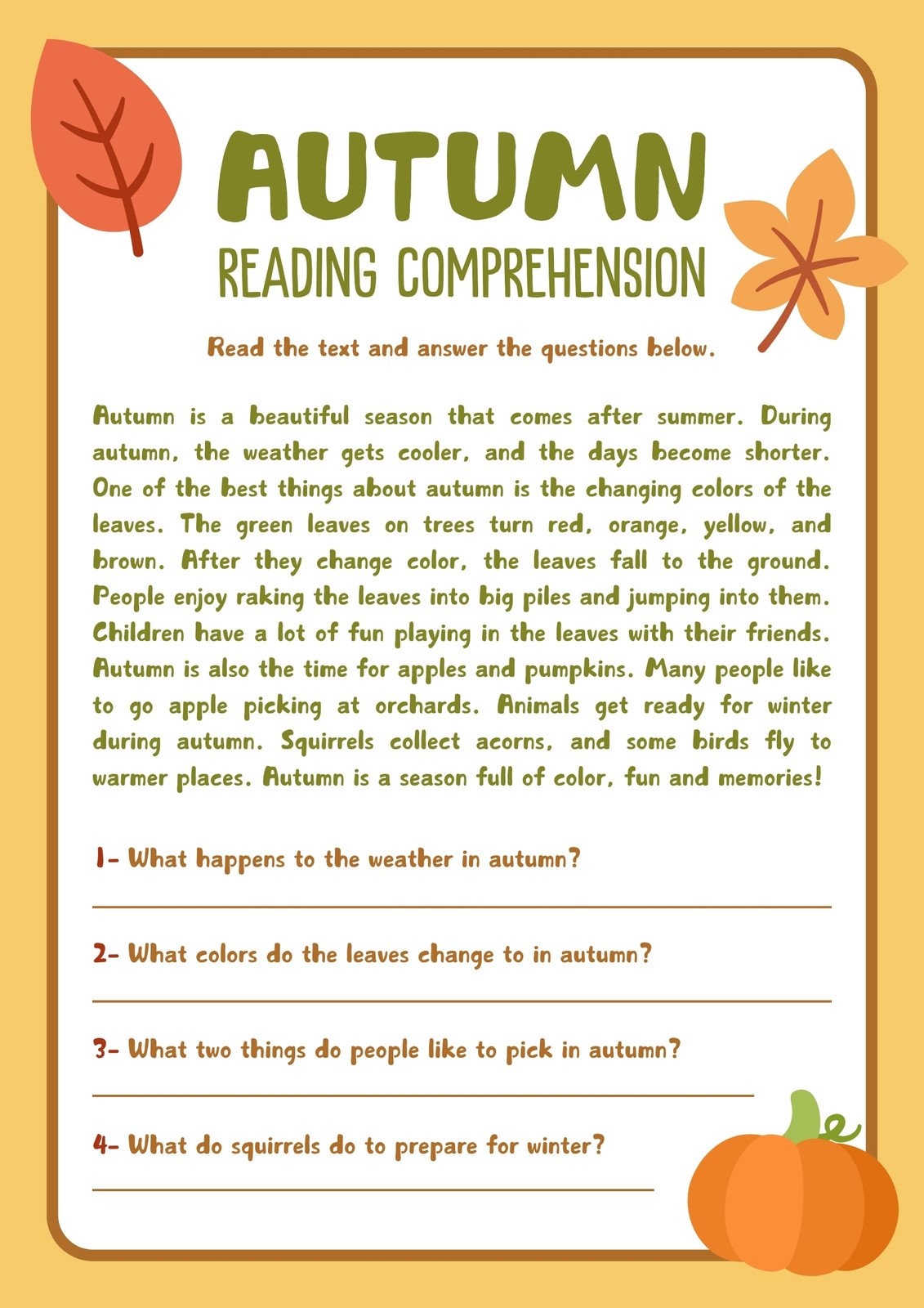 Fall Reading Comprehension Worksheets Pdf