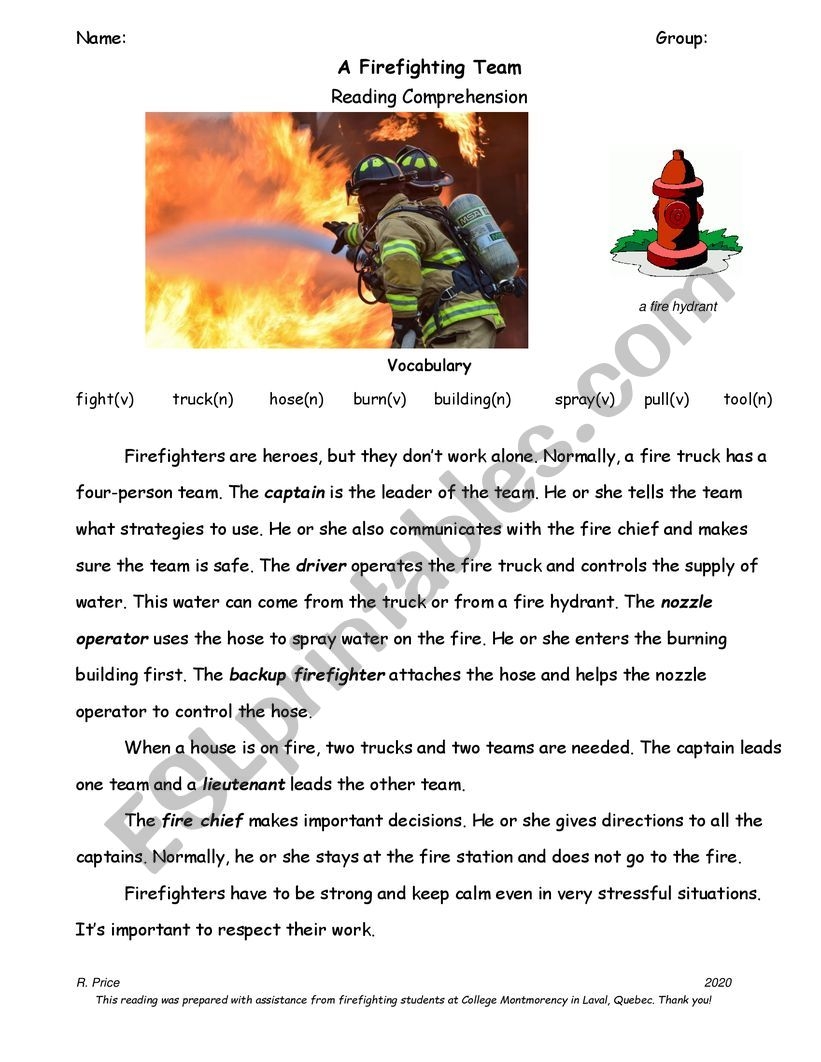 Firefighter Reading Comprehension ESL Worksheet By MsRachelQuebec