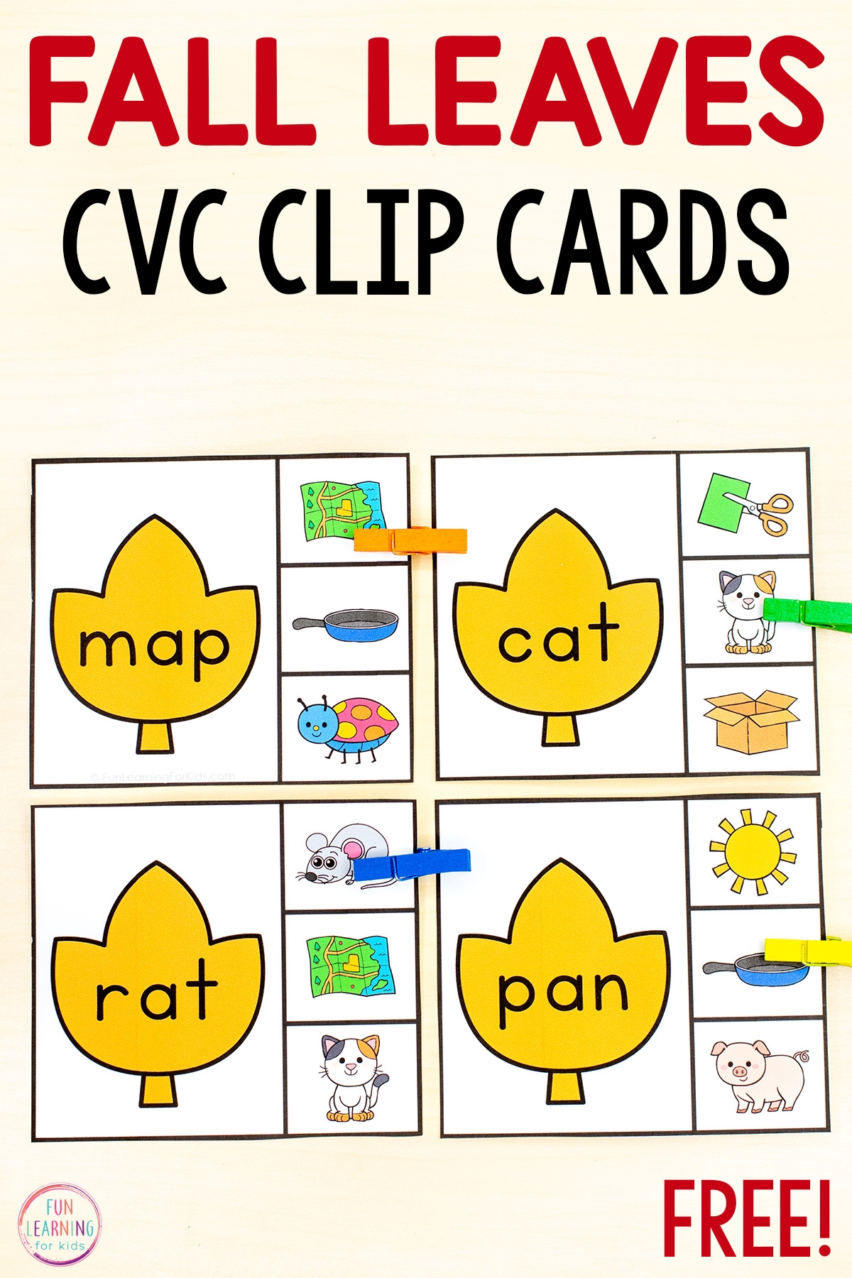 Fall Leaves CVC Clip Cards Free Printable