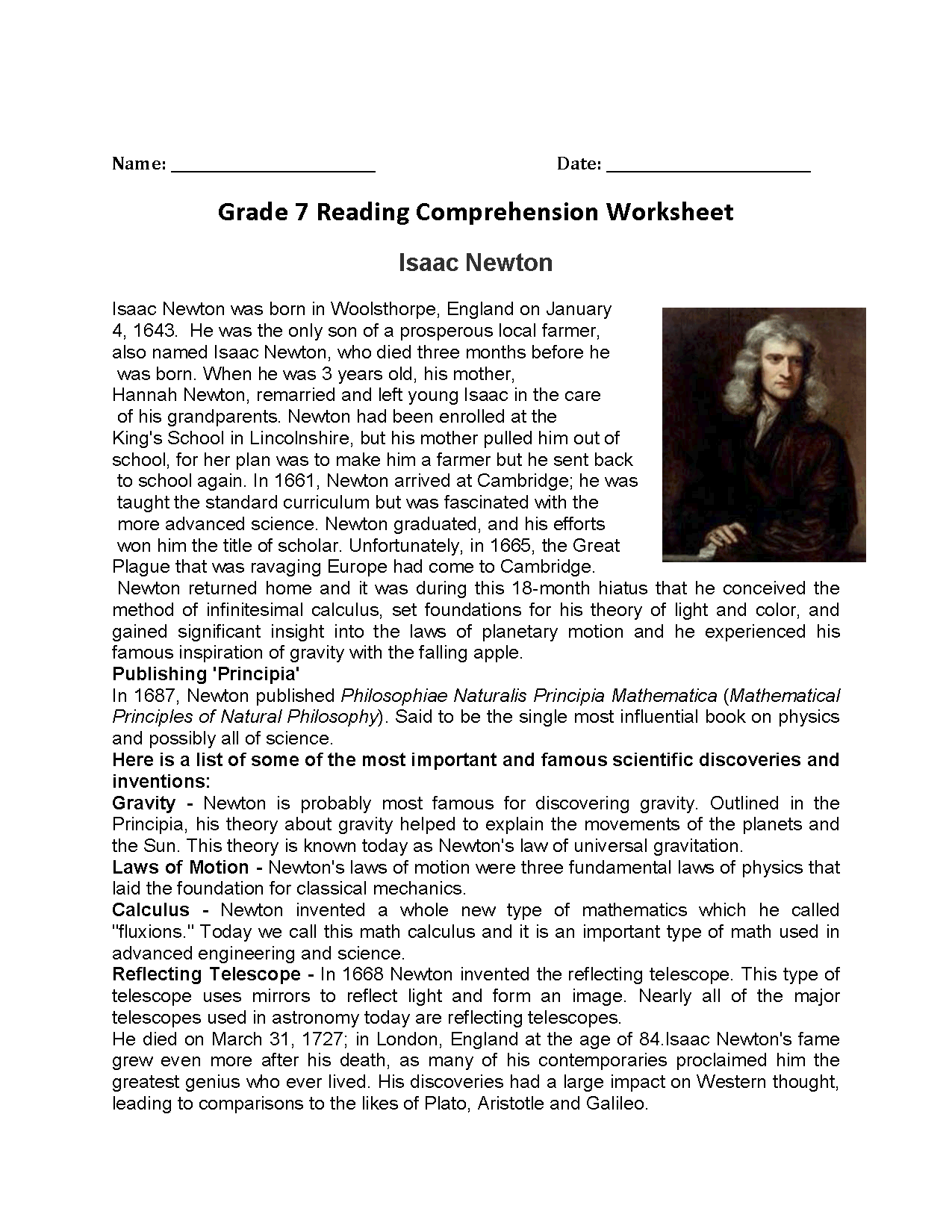 Reading Comprehension Worksheets Seventh Grade Reading Comprehension Worksheets