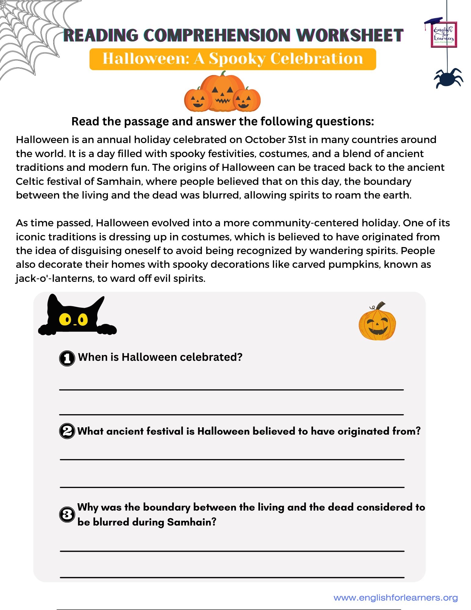 This worksheet features spooky stories, interesting facts about Halloween traditions, and challenging questions to test your understanding. It’s a great way to get into the Halloween spirit while also practicing your reading comprehension skills.