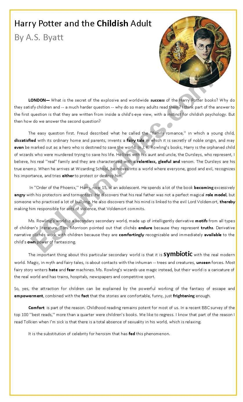 ESL Reading Comprehension Writing Activity Worksheet On Harry Potter