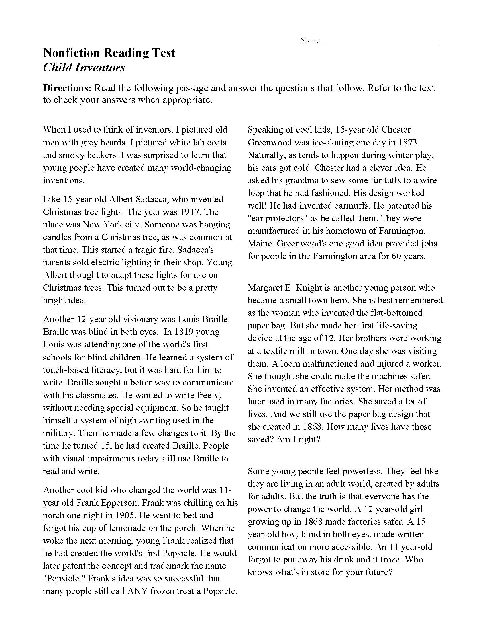 Child Inventors Nonfiction Reading Activity
