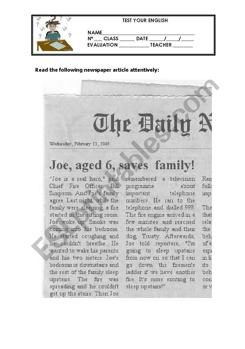 Newspaper Articles Reading Comprehension Activity ESL Worksheet
