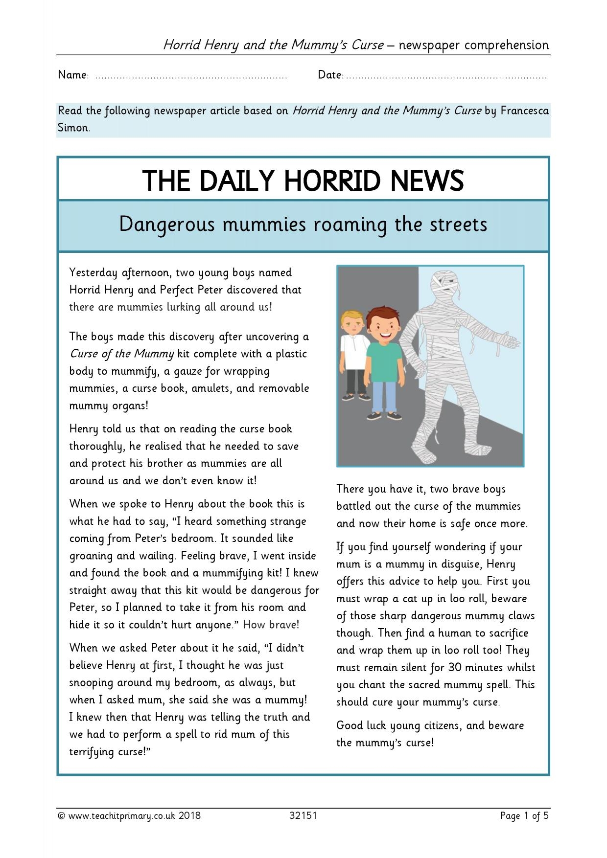 Horrid Henry Newspaper Comprehension Comprehension KS1 2 Teachit