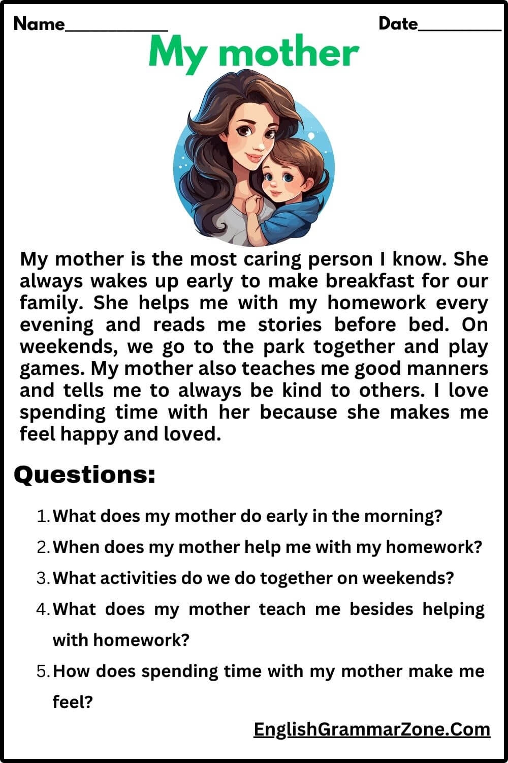 Reading Comprehension My Mother With Answer
