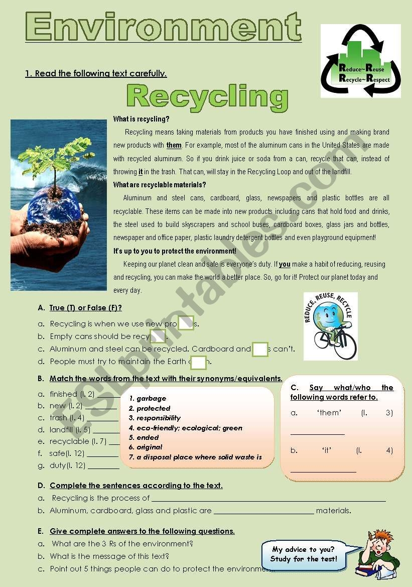 Recycling Reading Comprehension Worksheet
