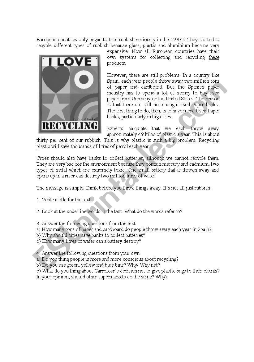Reading Comprehension About Recycling ESL Worksheet By Mrope