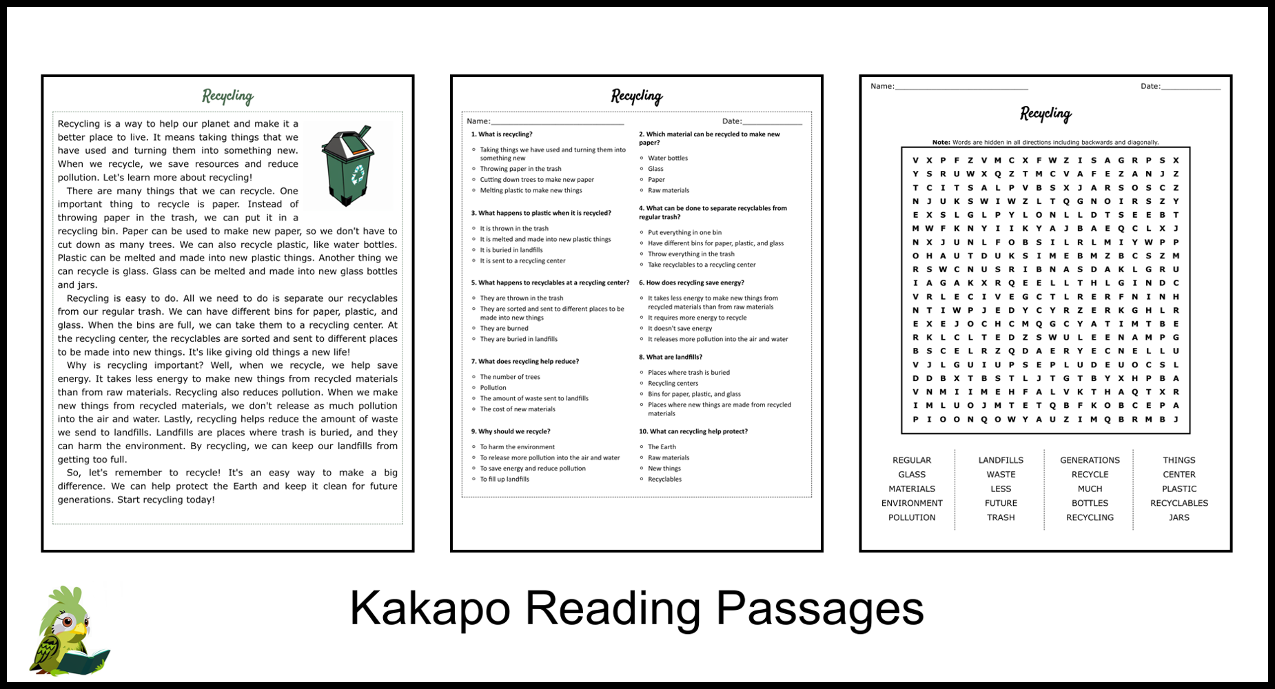 Recycling Reading Comprehension And Word Search Teaching Resources