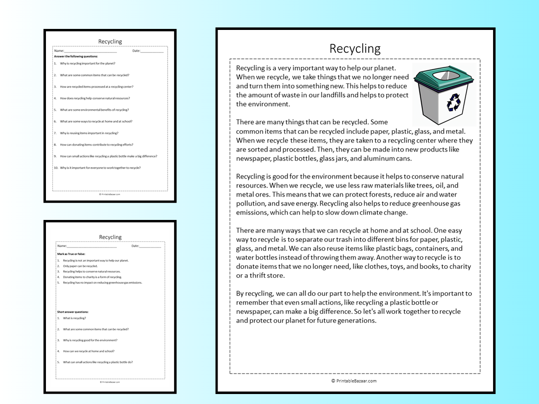 Whether you’re a teacher looking for a new way to teach your students about recycling or a parent wanting to educate your child about the importance of sustainability, our Recycling Reading Comprehension Worksheet is the perfect resource for you. Download it today and start making a difference!