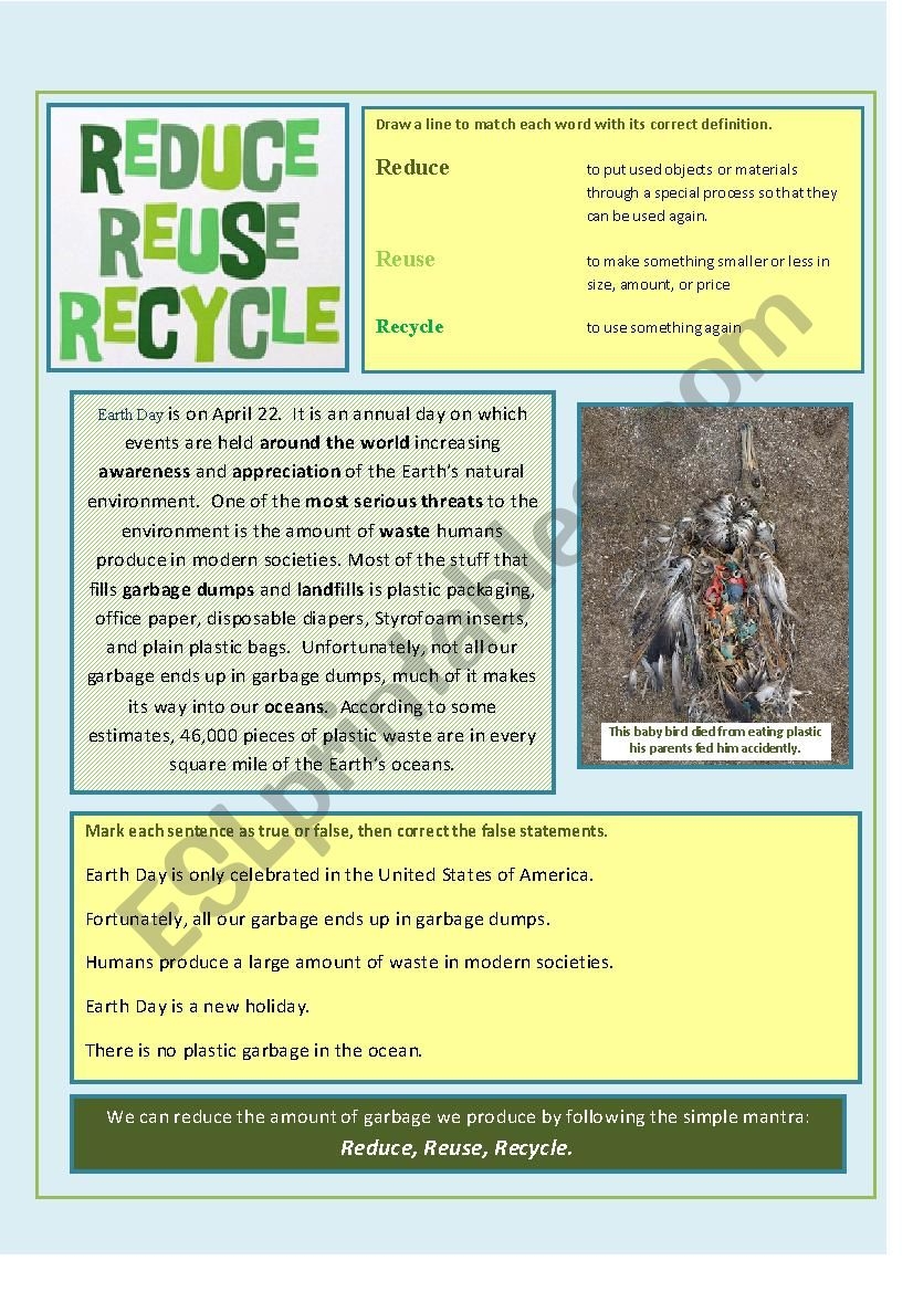 Reduce Reuse Recycle ESL Worksheet By Bonniejeanne