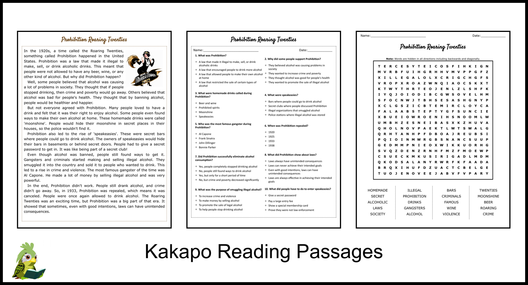 Prohibition Roaring Twenties Reading Comprehension And Word Search Teaching Resources