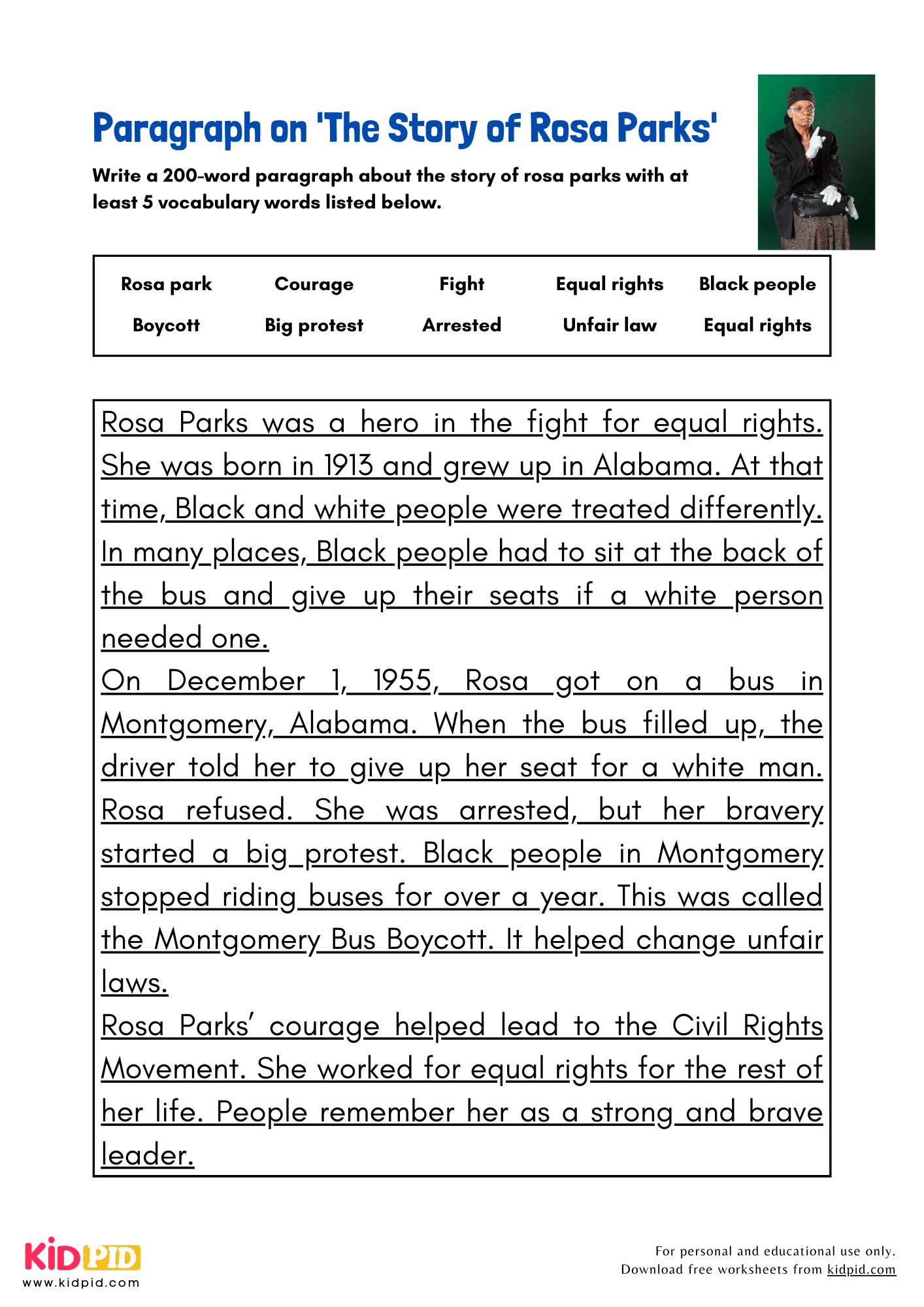 With these worksheets, students can learn about Rosa Parks’ early life, her activism, and the impact she had on the civil rights movement. They can also practice their reading comprehension skills by answering questions about her life and achievements.