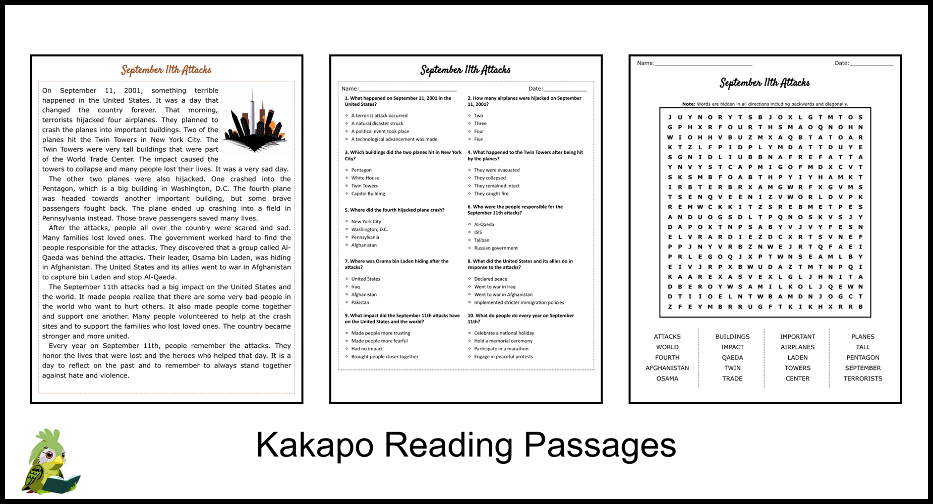 These worksheets are designed to help students improve their reading skills while learning about the events of September 11th, 2001. They cover a range of topics related to the attacks, including the timeline of events, the impact on the United States, and the heroes who emerged that day.