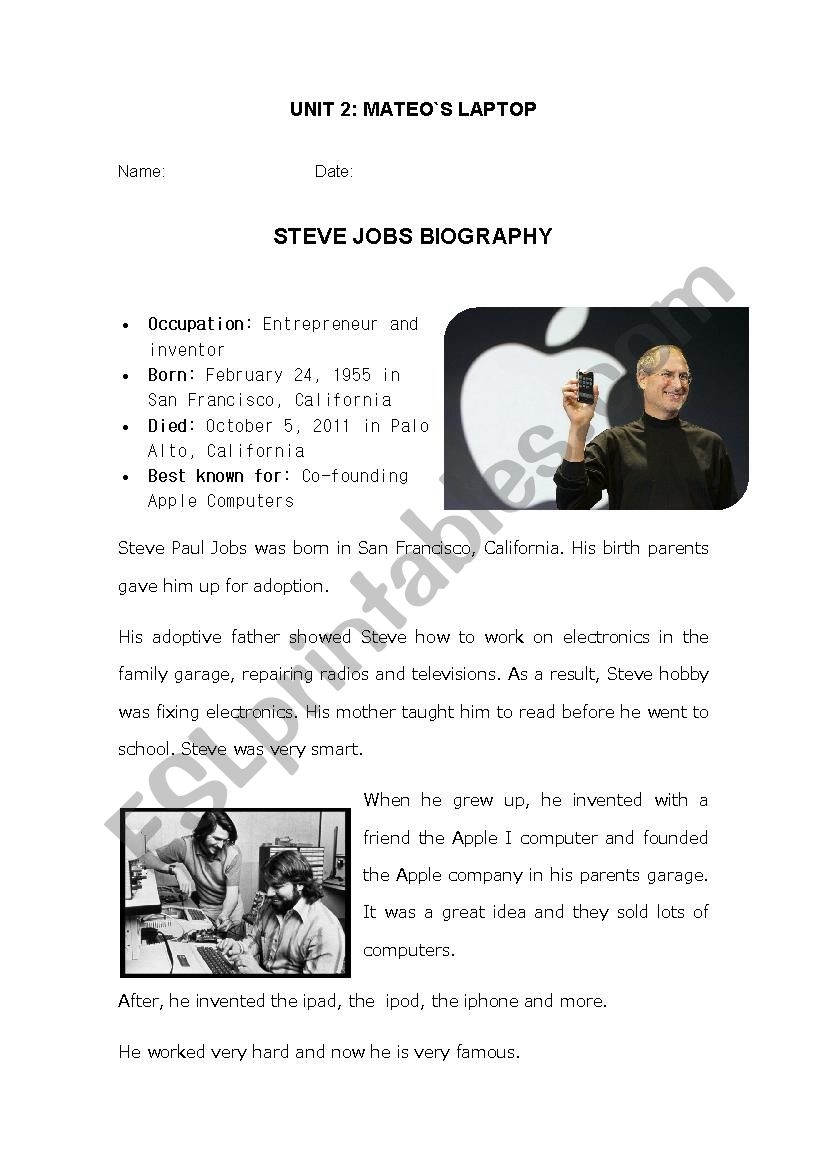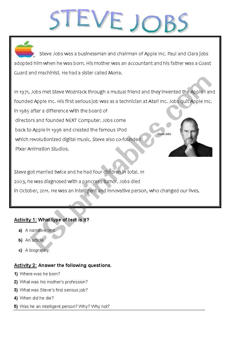 Reading Comprehension Steve Jobs Biography ESL Worksheet By Liviatelles