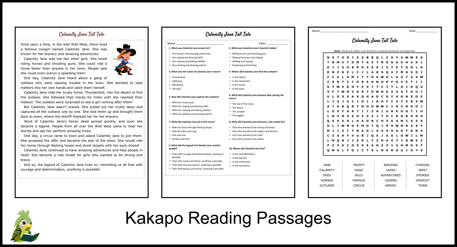 Calamity Jane Tall Tale Reading Comprehension And Word Search Teaching Resources